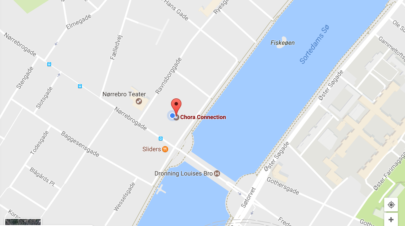 Chora Connection ligger på Sortedam Dossering 3D, 3, på Nørrebro nær Dronning Louises Bro. Benyt dørtelefonen i gården ved ankomst